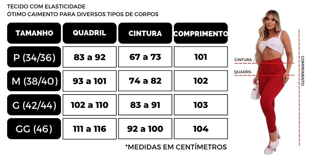 Disponível nos tamanhos do P ao GG, essa calça veste do 34 ao 46, garantindo flexibilidade e conforto para diferentes tipos de corpos.